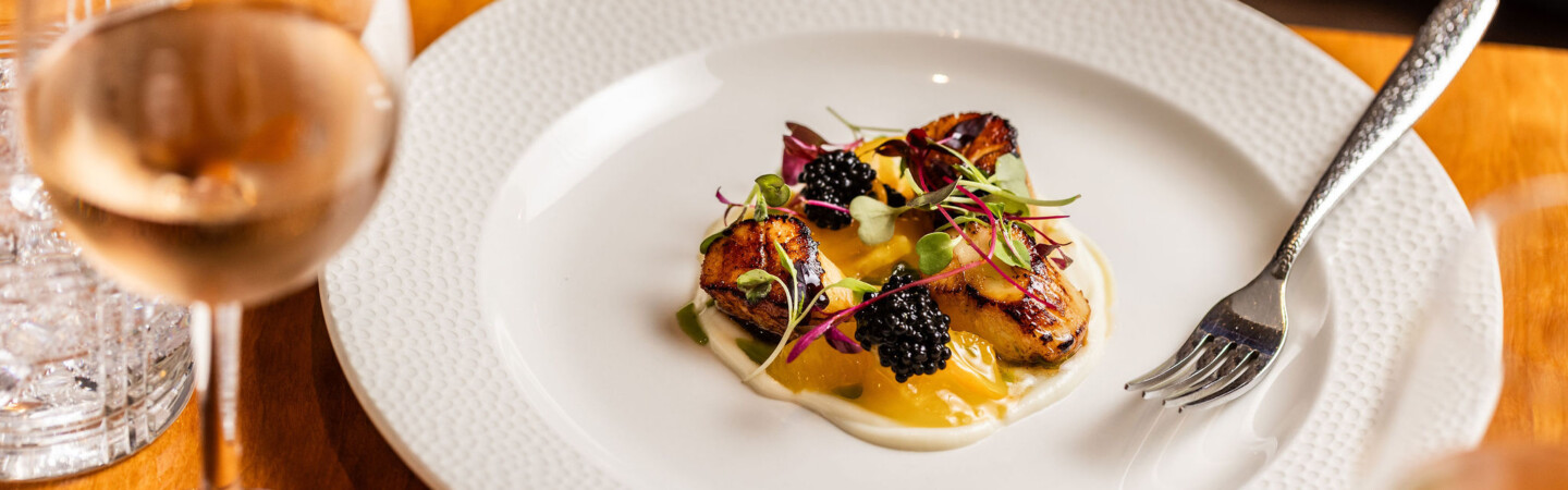 Seared Hand-Dived Jersey Scallops, Celeriac purée, caviar, orange marmalade